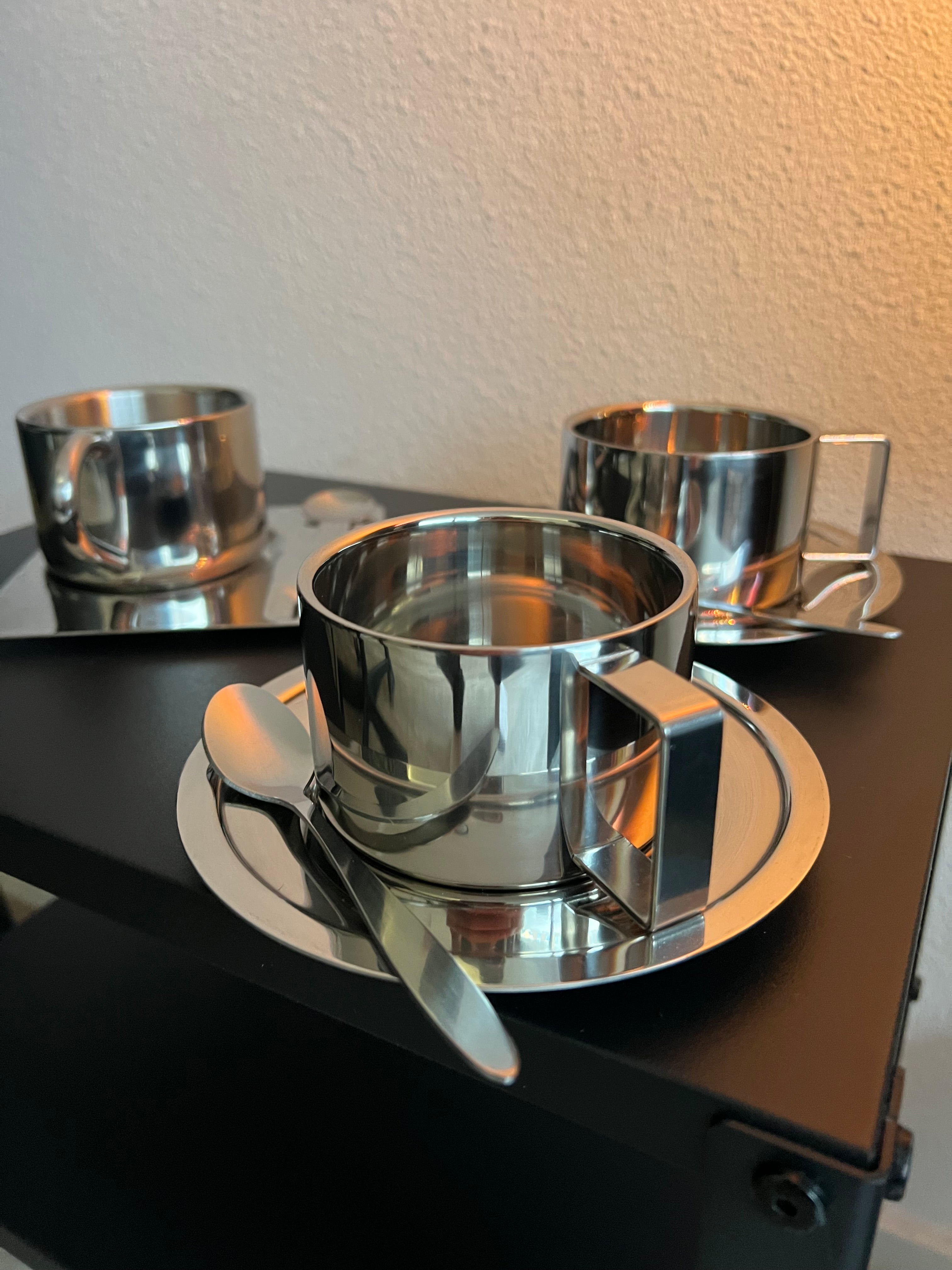 Deze RVS Koffieset Brelle (Vierkant) bestaat uit een RVS Koffiekopje, RVS lepeltje en een RVS Serveerschoteltje.